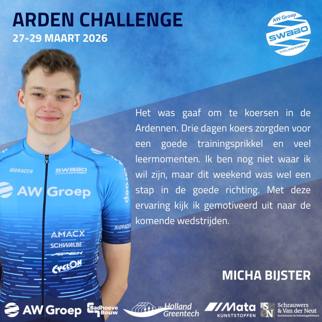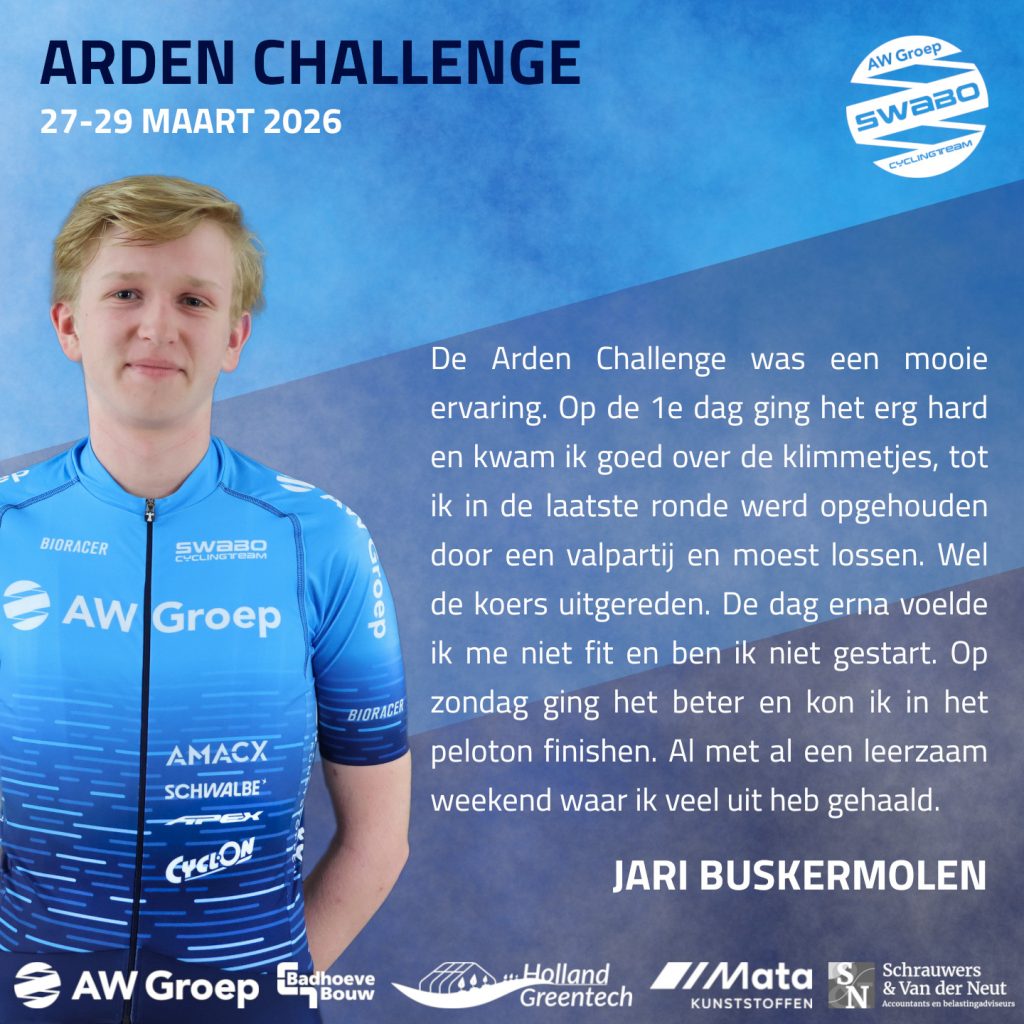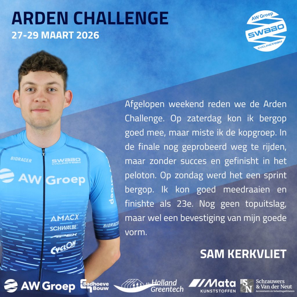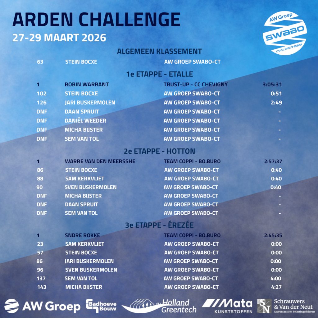 Afgelopen weekend stond de Arden Challenge op het programma, drie zware etappes met veel hoogtemeters. Door valpartijen verloren sommige renners helaas te veel posities op cruciale momenten. Desondanks zijn er mooie prestaties geleverd en deden de renners veel waardevolle ervaring op voor de komende wedstrijden.